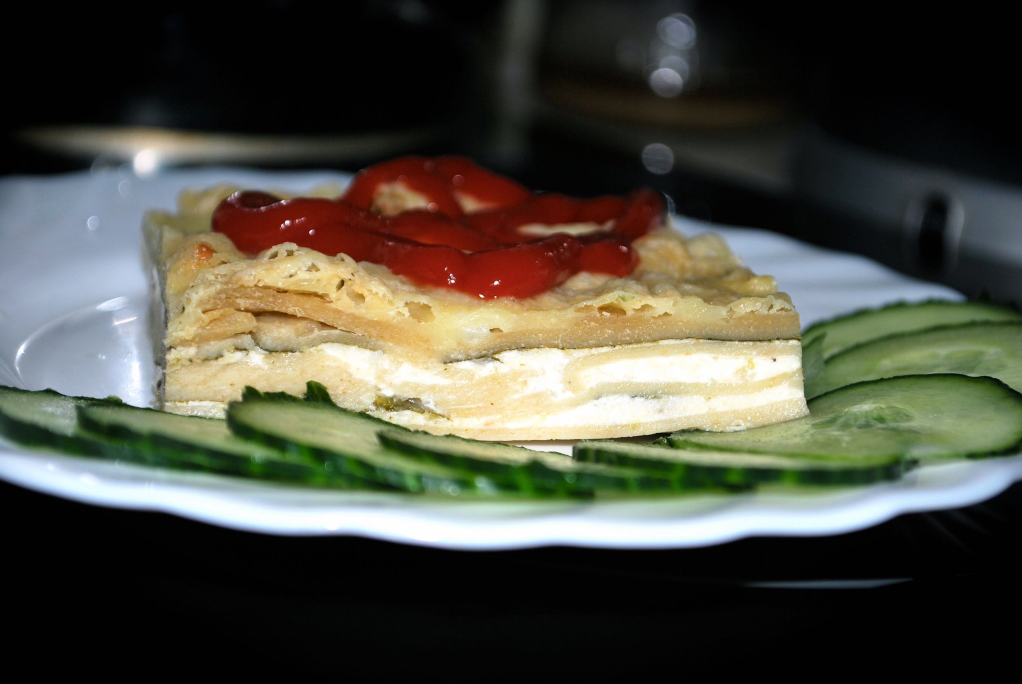 Egy tűzálló tálat sütőpapírral kibéleltem, egy tortaformát. Nem találtam jobbat. 🙂 Két-három lapot tettem a papírra, majd jött egy adag krém, pár levél spenót, majd reszelek rá kevés fokhagymát, megint tésztalap, krém, és spenót levél, végül pedig a maradék tészta, a tészta tetejére pedig reszelt sajt.